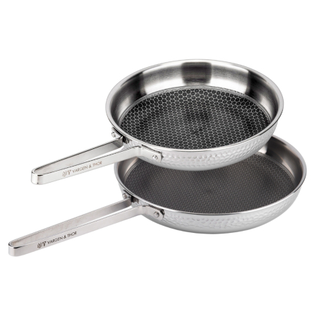 Med KROMA från Vargen & Thor får du ett stekpanneset i två delar som kombinerar stilren design med hög prestanda. Setet innehåller två matchande stekpannor på 22 cm och 28 cm – perfekta för både vardagsmatlagning och mer avancerade rätter. Den robusta 3-lagerskonstruktionen med en kärna av aluminium ger snabb och jämn värmefördelning, medan den hamrade och polerade stålytan skapar ett exklusivt och elegant uttryck i köket.