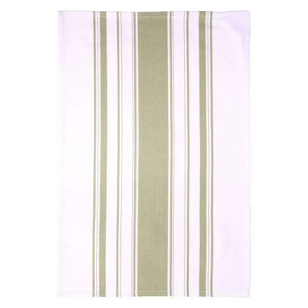 Denna randiga kökshandduk i den mjuka nyansen sage (salviagrön) är tillverkad i 100 % bomull, vilket gör den både slitstark och absorberande. Den tål maskintvätt och är lika praktisk som dekorativ – perfekt för både disk, bakning och servering.